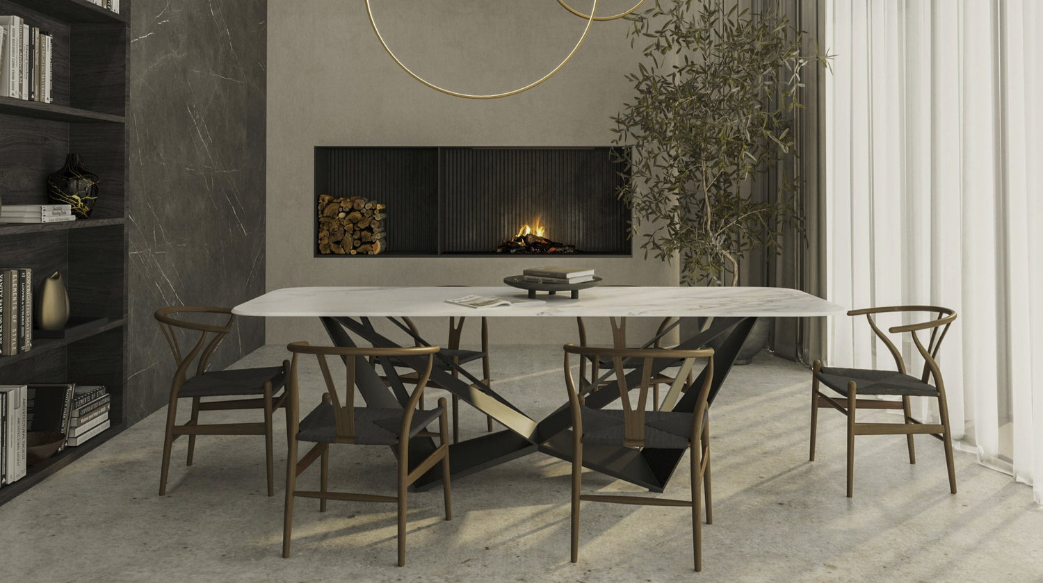 სასადილო მაგიდები სხვადასხვა მასალისა და ფორმის კომბინაციით